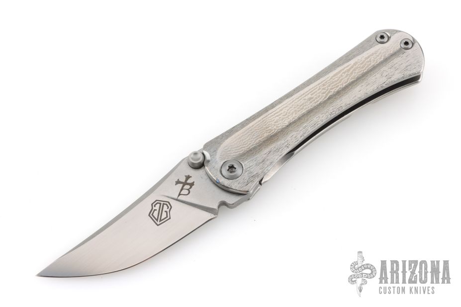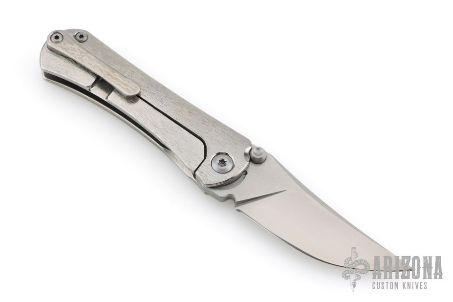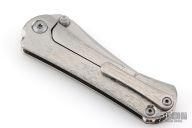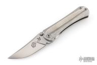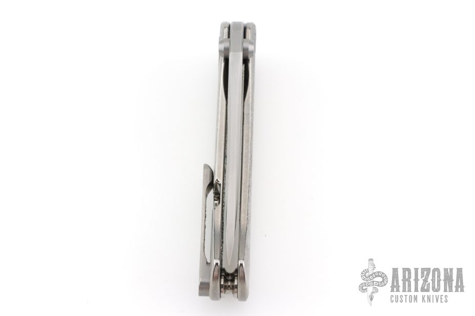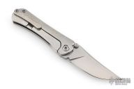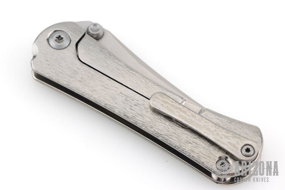 This SBKF by Borka Blades features a sating finished blade with swedge and dual thumbstuds. The handle has a textured and polished titanium frame with a matching tip up clip. Nice detent, lockup and blade seating. Comes with zippered case and both maker's cards one dated 6-1-2018. Both maker's logos featured on the blade. Excellent condition.
