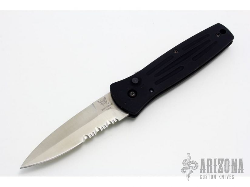 The 3500 automatic is a Mel Pardue design. Side opening, coil spring. Satin finish spearpoint blade with partial serration. Non-reflective black aluminum handle. Black coated stainless steel clip. Perfect function. A couple of light scuffs on handle and clip but overall excellent condition.