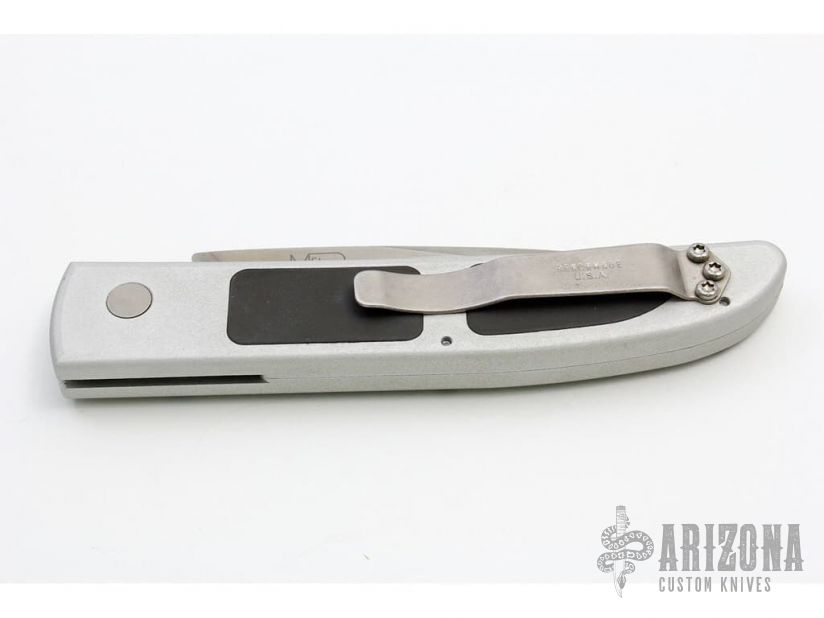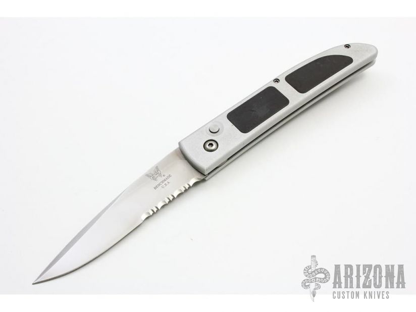 This Mel Pardue designed automatic has a satin, partially serrated blade. Bead blast aluminum handle  with rubber non slip inserts. Strong opening action and good lockup - no blade play. Good condition with minor scuffing/soiling on the handle and some light scratches on blade.