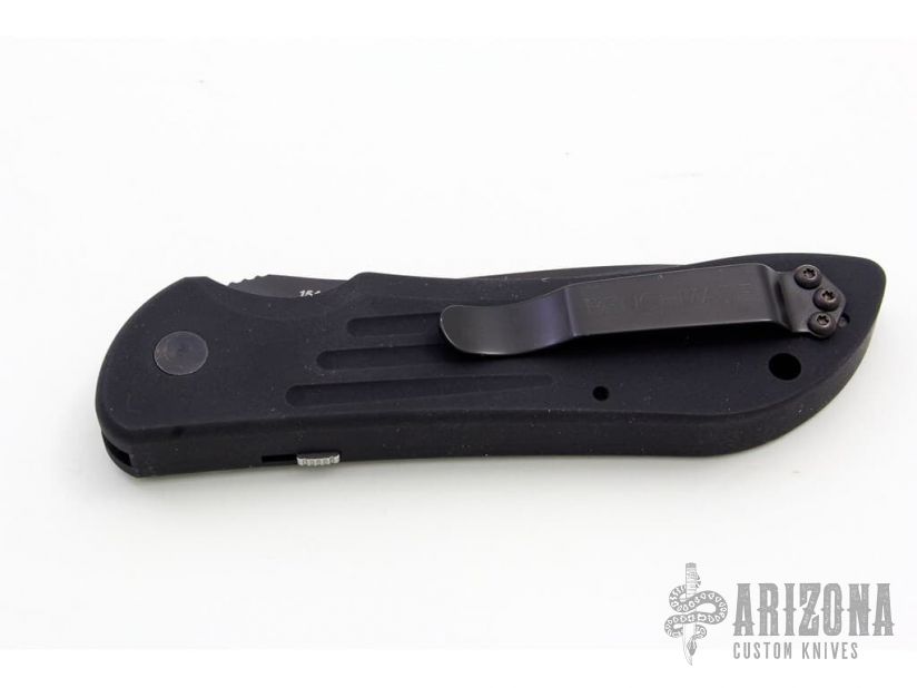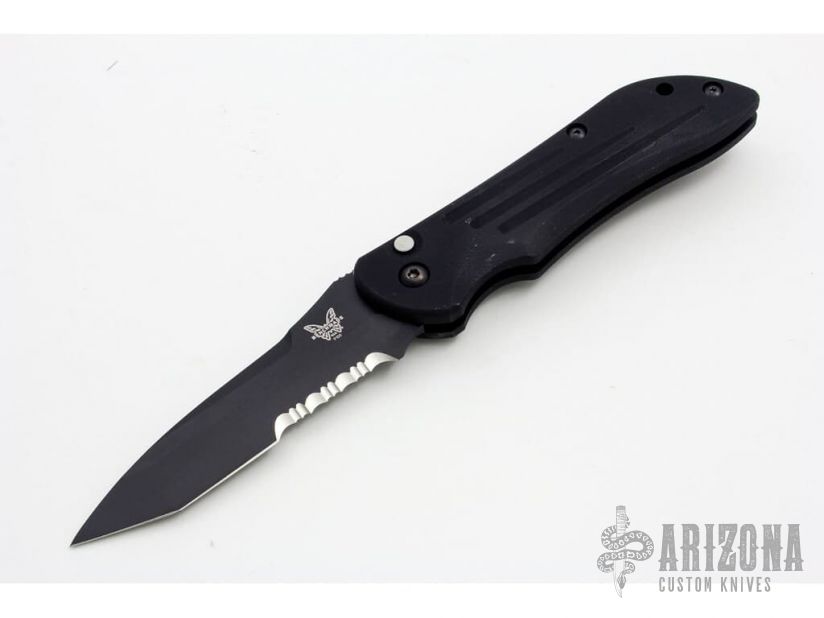 Black coated partial serrated tanto blade, black machine grooved, contoured handle, index finger notch, filed thumbrest. Button activated open/close auto with an integrated spine mounted slide safety. There are a few scuffs on anodized handle but blade is mint.