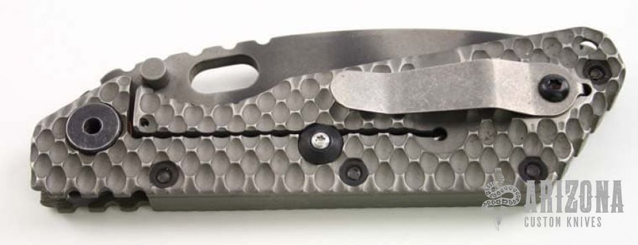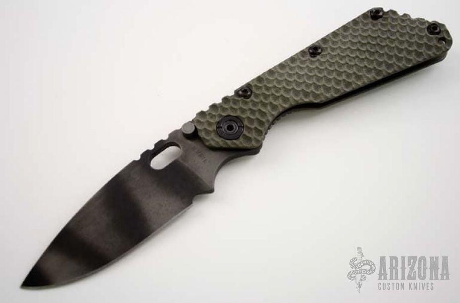 This SMF features a tiger stripe finish blade and Gunner Grip scales, green G10 on one side and titanium on the other. Titanium clip. Notches on thumbrest, rear of handle, and lockup. Includes Hinderer "Lock Bar Stabilizer" for maximum reverse lock retention. Mint condition.