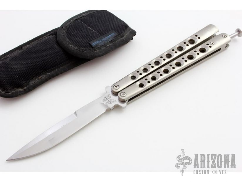 This Balisong features a satin finish blade and stainless steel handles. Includes original box and sheath. Blade and handle show signs of use with numerous scratches.