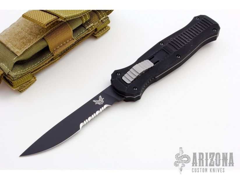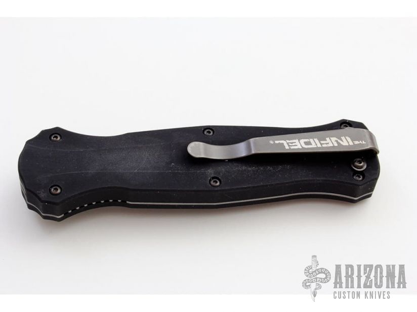 "Introducing an OTF like none-other.. The new Infidel® is rapidly making believers out of many a skeptic. Built for strength and reliability the patent pending double-action mechanics get it done over the long haul. Grab on and you will find the handle grip rock-solid with its patented machined in Presidio® style bi-directional tread pattern, and overall generous sizing for gloved hands. Intuitively pressure the release-slide forward and its spear-point edged steel fires and locks up with a unique three-point retention system with amazingly negligible blade play. Reverse the process and the blade retracts in a rapid blur of motion.Black drop point partially serrated blade. Includes nylon Velcro sheath. Excellent condition with just a couple of scuffs on handle. Perfect function. Blade Steel: S30V