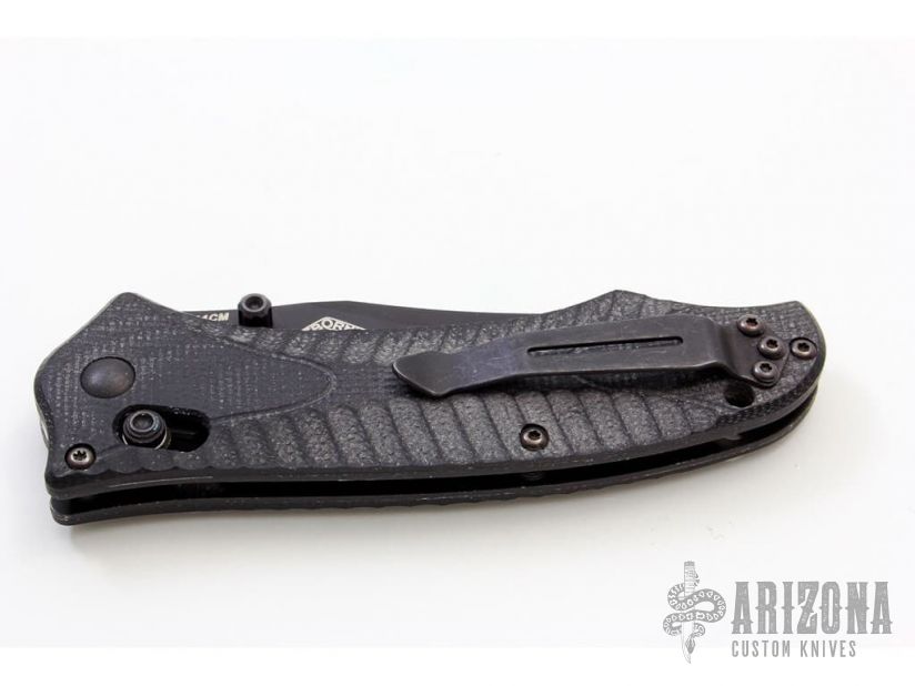This axis locking folder features a black clip point blade with dual thumb-studs. The handle has carved black G-10 scales, and black stainless steel liners and clip, tip up carry left or right. Comes with an OD Green TAD Gear nylon Velcro sheath and original drawstring bag. The clip has some light scuffing, otherwise great condition. Blade Steel: 154CM @ 58-61 HRC