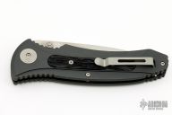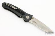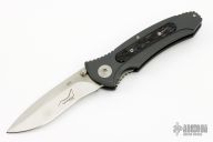 This liner lock folder features a satin finished spear point recurve blade with false top edge and dual thumbstuds. The handle has a titanium frame with black jigged bone scales and a titanium tip up clip. Comes with original box and papers. Nice detent, lockup and blade seating, Good condition. Blade Steel: 154CM