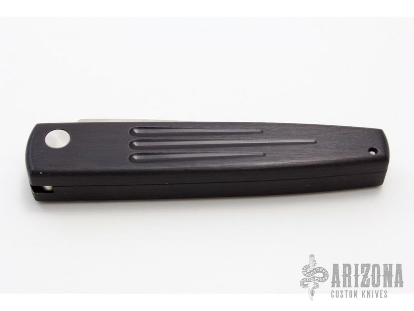 Side opening automatic with a satin finished blade and black anodized aluminum frame. Knife is in great shape, shows no signs of use, only light areas of discoloration on blade, light scratch on release button. This model is becoming harder and harder to find, especially in this condition. Knife comes in a black, rayskin pouch.