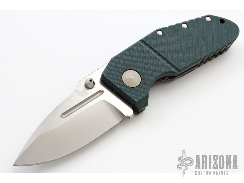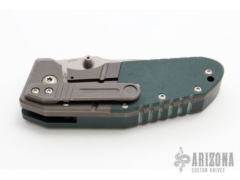 Shane Sibert design. Features a satin finished blade with dual thumb-studs and notched thumb-rest. Thandle is green G-10 and titanium. Titanium pocket clip, tip down carry. Includes original packaging.  Has some scuffs on the frame, otherwise great condition. Blade Steel: 0.164" M390 Stainless Steel @ 60-62 HRC