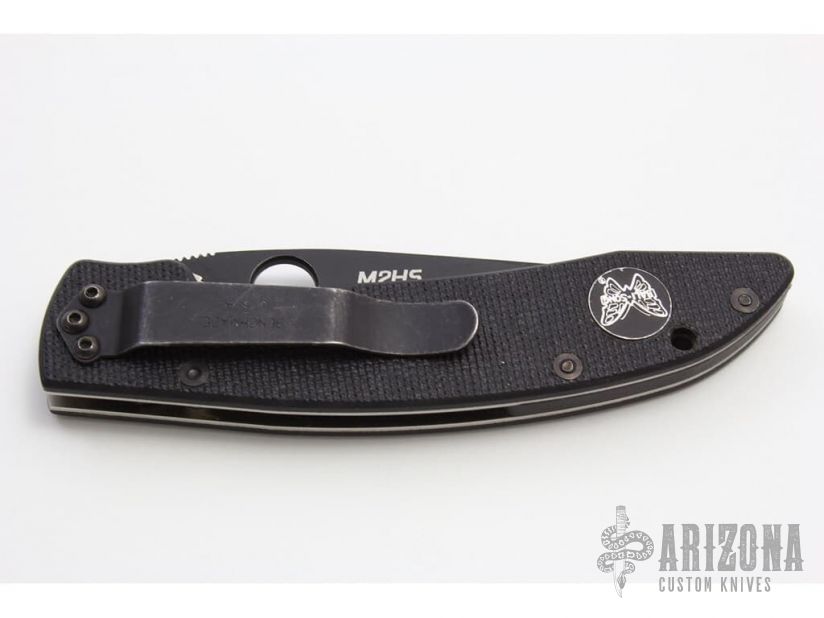 This AFCK Linerlock folder has an M2HS (limited run blade steel) clip point blade with partial serrations, thumb hole, and notched thumb rest. Handle is black G10 over stainless steel liners, black fiber back spacer, lanyard hole, and black stainless steel tip down clip. Handle, clip, and blade show minor light scuffs, but overall, this knife is in very good condition. Perfect EDC piece, and priced accordingly. Blade Steel: Black M2HS