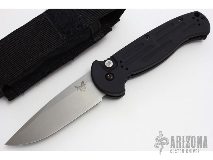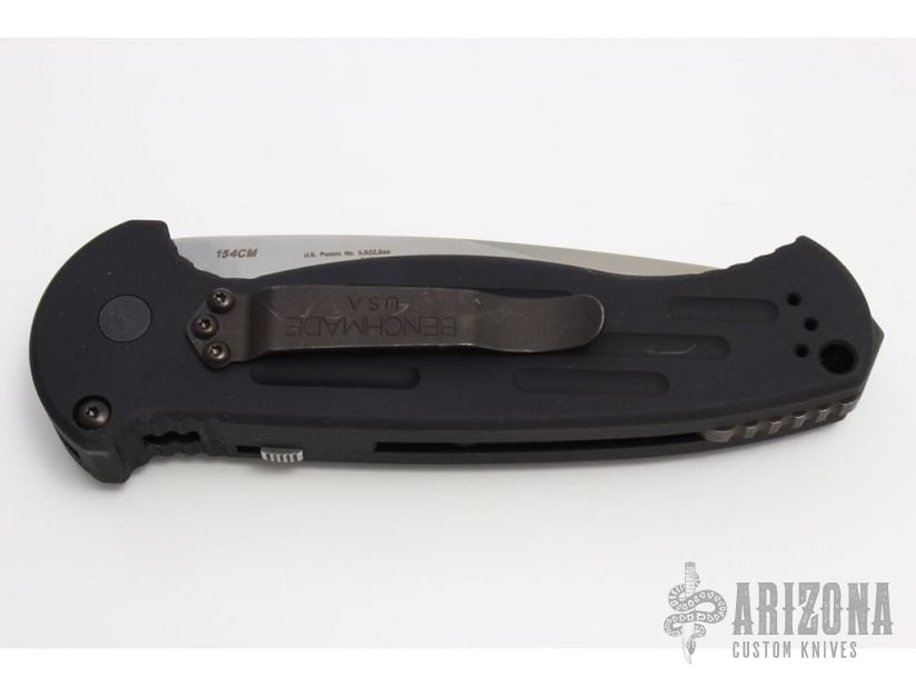 This 9051 AFO II auto has a spear-point blade with flast top edge. Black anodized aluminium handle. Integrated safety system. Black stainless steel clip - 4 way reversible, and lanyard hole. Mint condition. Comes with original nylon sheath, and original box and papers. Blade Steel: 154CM