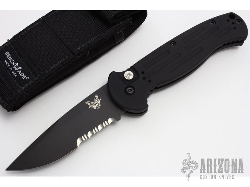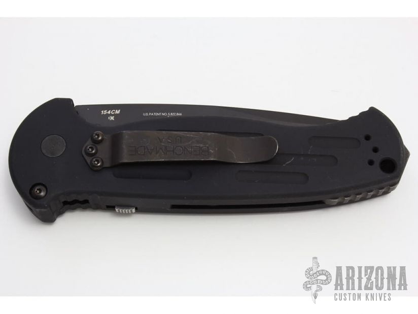 This 9051 AFO II auto has a black spear-point blade with flast top edge and partial serrations. Black anodized aluminium handle. Integrated safety system. Black stainless steel clip - 4 way reversible, and lanyard hole. Mint condition. Comes with original nylon sheath, and original box and papers. Blade Steel: 154CM