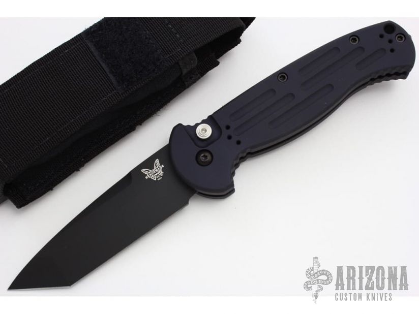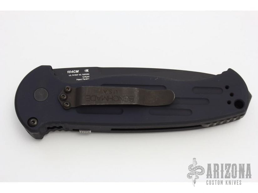 This 9052 AFO II auto has a black tanto blade. Black anodized aluminium handle. Integrated safety system. Black stainless steel clip - 4 way reversible, and lanyard hole. Mint condition. Comes with original nylon sheath, and original box and papers. Blade Steel: 154CM