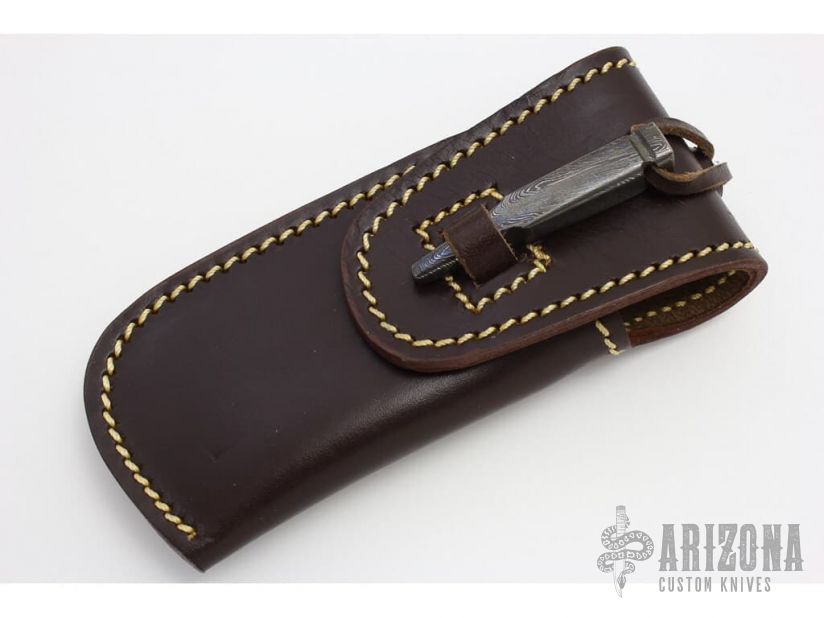 Premium leather sheath with belt loop and Damascus closing pin.  Fits many small to mid-size folders.  Max length of folded knife - 4.25".