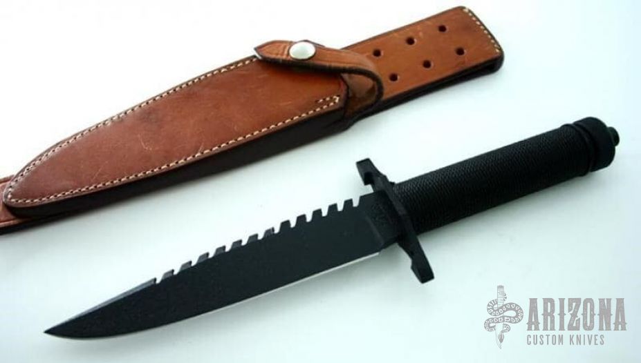 This Mini "First Blood" has a black coated blade and fittings, and a black nylon wrapped handle. 3/16" blade thickness and 1 1/4" blade depth. The aluminum butt cap unscrews to reveal a hollow handle. This is one of only six Mini "First Blood" knives made in all black. Has the Lile stamp with dot. Includes original sheath. The sheath has some minor wear. The knife is in mint condition.