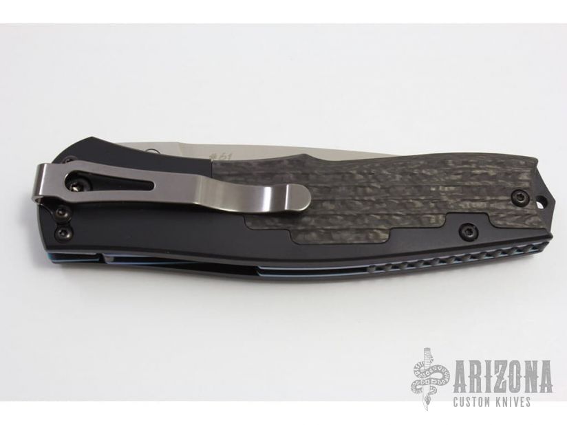 Limited edition assisted linerlock with modified drop point M390 blade.  Handle is black aluminum and detailed carbon fiber.  Green/blue anodized titanium liners with notched backspacer. Nitrous Assist opening make it almost effortless to pop open the blade. Great lockup. Mint condition with original box, case, pouch and papers. #61. Blade Steel: M390
