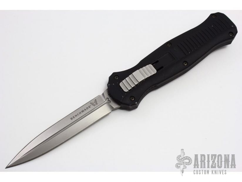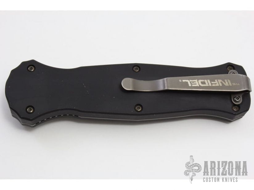 This double action out-the-front auto features double edge spear-point with ambidextrous thumb-slide. Blade is made of D2 tool steel (60-62HRC). Black anodized, machined 6061 T-6 aluminum handle with removable deep pocket pocket clip. Integrated cleaning port. Has a few scuffs on the frame, good Condition. Blade Steel: D2