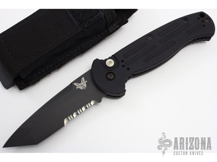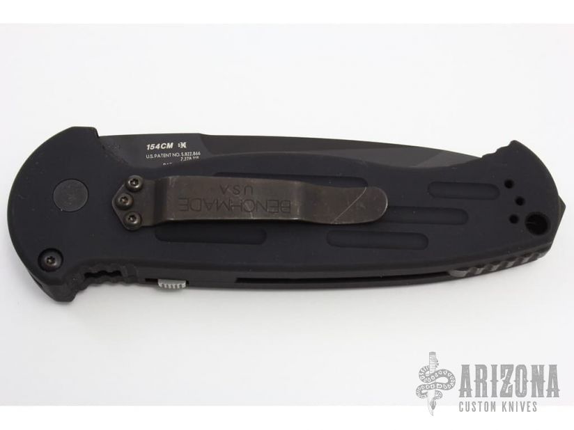 This 9052 AFO II auto has a black tanto blade with partially serrated edge. Black anodized aluminium handle. Integrated safety system. Black stainless steel clip - 4 way reversible, and lanyard hole. Has a light scuff on the frame, excellent condition. Comes with original nylon sheath, and original box and papers. Blade Steel: 154CM