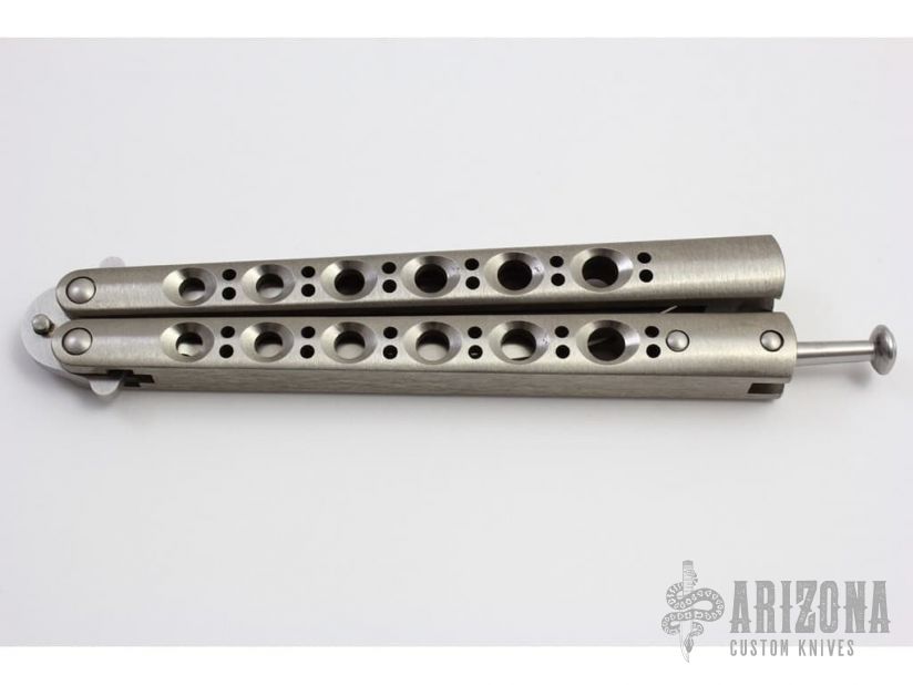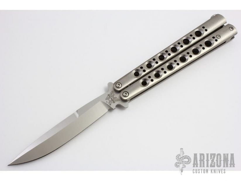 This Balisong features a satin finish blade and titanium handles. Has spring latch. Near mint. Original pouch/sheath. Blade Steel: CPM154