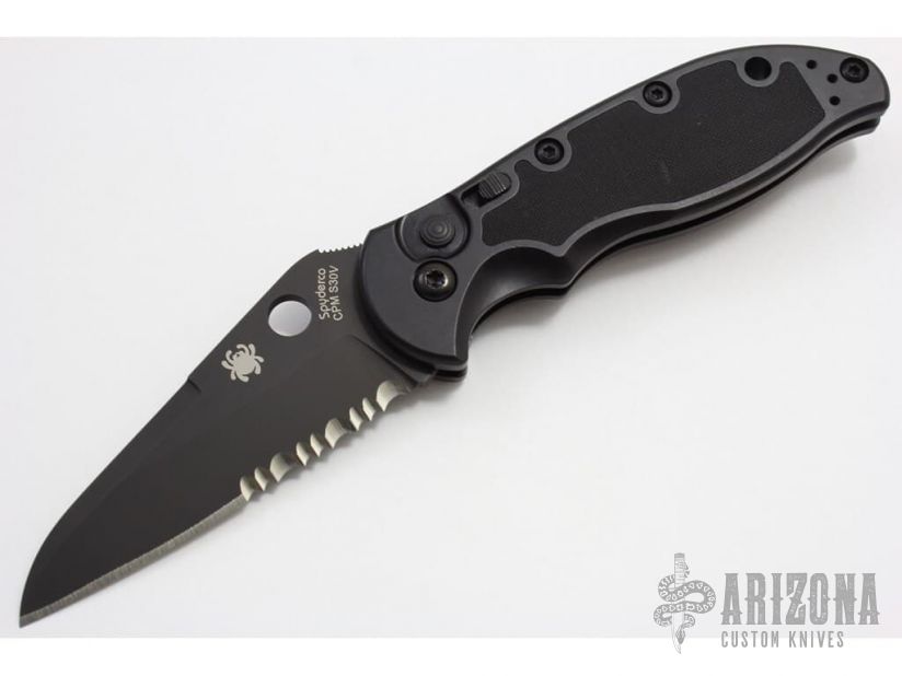 This side opening automatic features a black finished partially serrated blade with swedge and thumb hole. Has notched thumb rest. Frame is milled and textured black aluminum with black G-10 insert and push button and safety. Clip is 3way reversible. Has a few scuffs and scratches, good condition. Blade Steel: CPM S30V