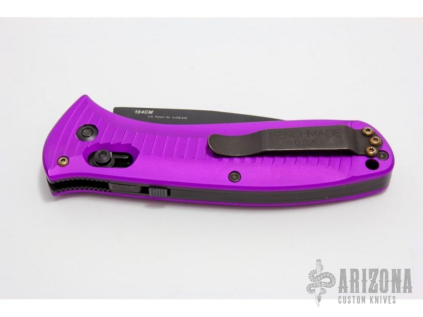 Mel Pardue design. Ambidextrous Auto Axis Pull Button Release - allows for automatic opening with either hand by pulling either Axis button back (buttons on each side of the handle). Integrated spine mount safety. Bi-directional machined handle grip for a superior sure grip.This is a limited edition purple handled version, numbered 7/50. Includes original box and paperwork. Mint condition. Blade Steel: .130 154CM @ 58-60 RC"