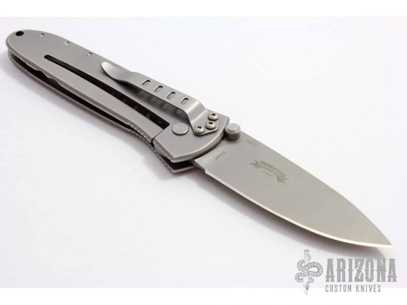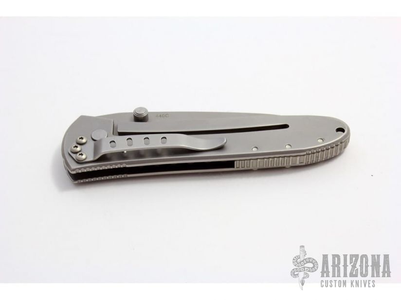 This knife features a fine bead blasted blade and handle with a tip down clip. Comes with original box and papers. Excellent condition. Blade Steel: 440C
