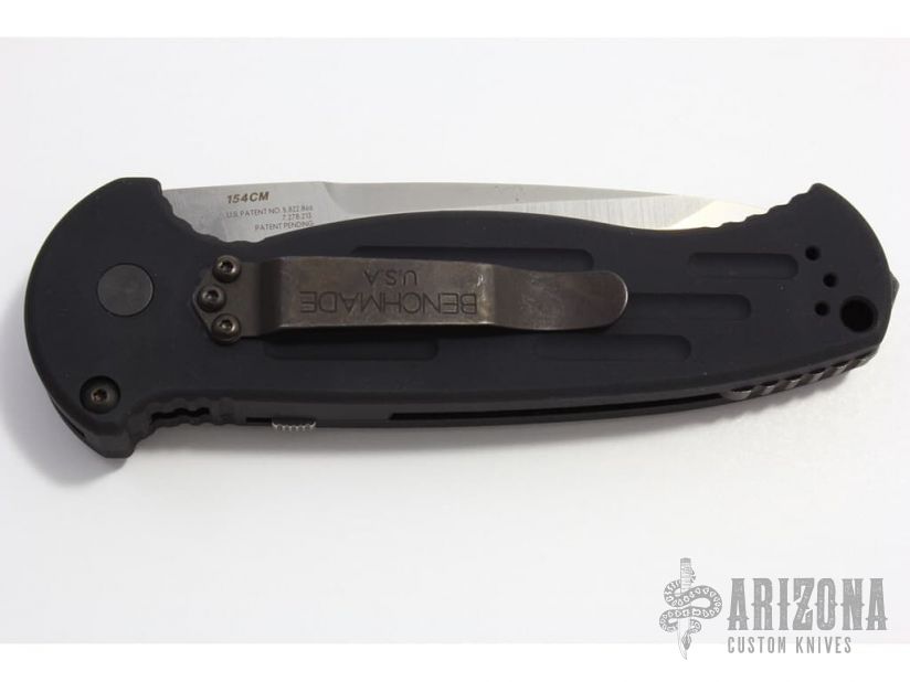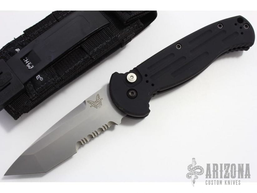 This 9052 AFO II auto has a tanto blade with partially serrated edge. Black anodized aluminium handle. Integrated safety system. Black stainless steel clip - 4 way reversible, and lanyard hole. Excellent condition. Comes with original nylon sheath, and original box and papers. Blade Steel: 154CM