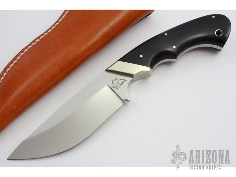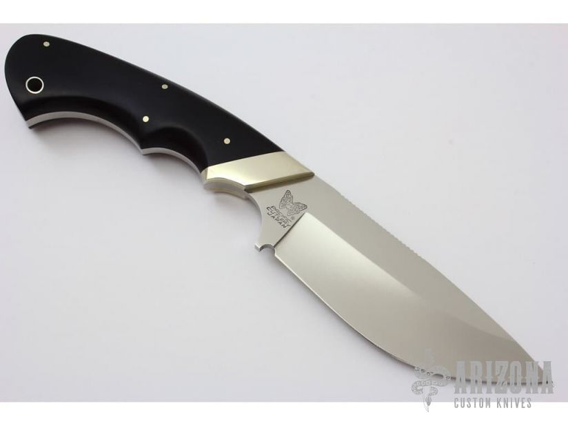 This Model 953 Drop Point Hunter has a satin finished stainless steel blade with full tang and notched spine. Blade stock is barely under 3/16", 1-3/8" depth. Handle is polished black paper micarta with nickel silver guard, nickel silver pins, and aluminum lanyard tube pin. Very fine (typical) scratches to nickel silver guard, otherwise this is a beautiful and very comfortable piece. Comes with original brown leather sheath. Excellent condition.