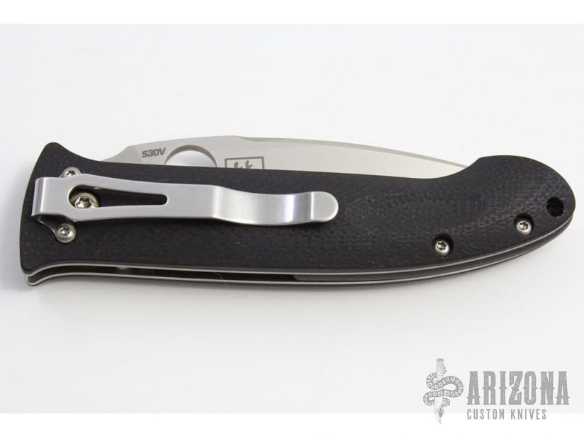 This knife features a satin finished drop point blade with false top edge and thumbhole. The handle has black G-10 scales, stainless steel and titanium liners, and a black FRN backspacer, tip down stainless steel clip. Includes original packaging. Excellent condition. Blade Steel: S30V