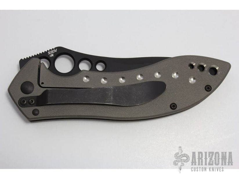 The Skirmish is a sought after tactical folder with a recurve blade, thumbhole opener and titanium frame. This particular example has the black coated standard blade with bead blast titanium handles. Tip down carry. Original box with papers. The blade and the frame have a few light scuffs. Good condition. Blade Steel: S30V