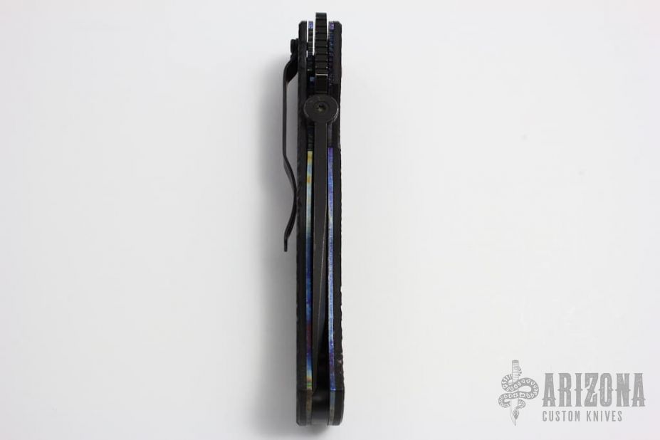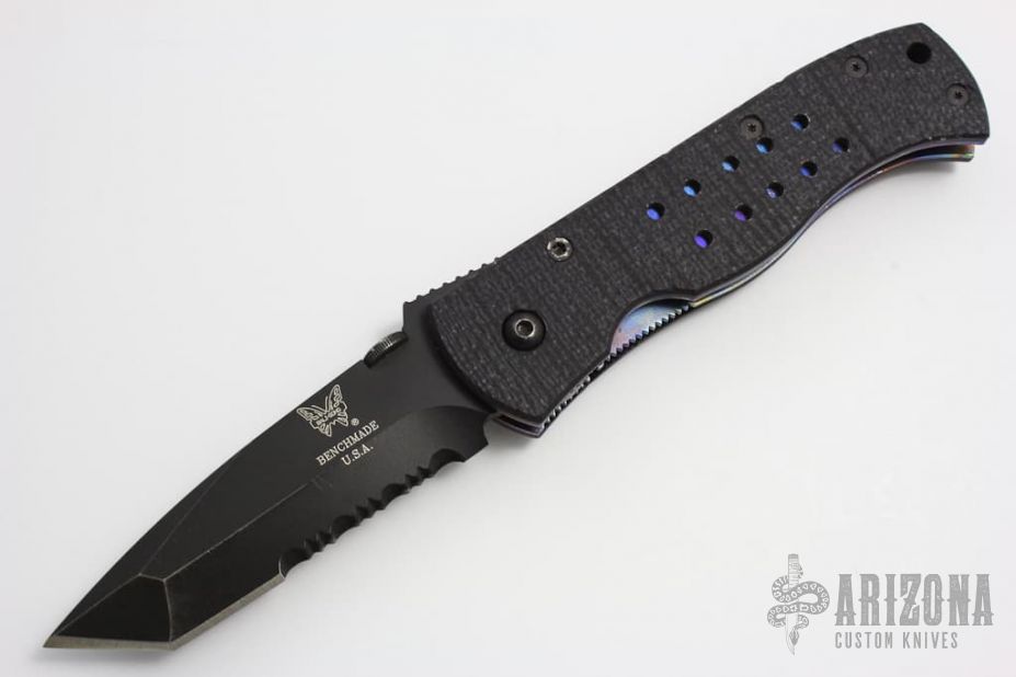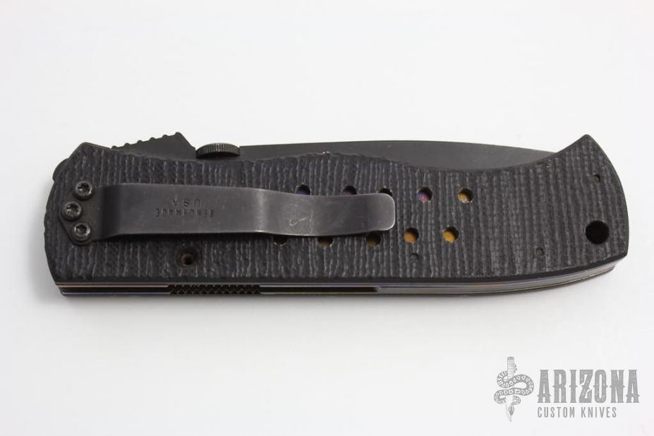 The 970S is the Benchmade version of the Emerson CQC7 folder. Has a black chisel ground tanto blade with partially serrated edge and thumbdisc. Has black G-10 scales that have a custom texture and holes to show the flamed titanium liners, black tip down SS clip. Has a few light scratches on the blade, good condition. Blade Steel: ATS-34