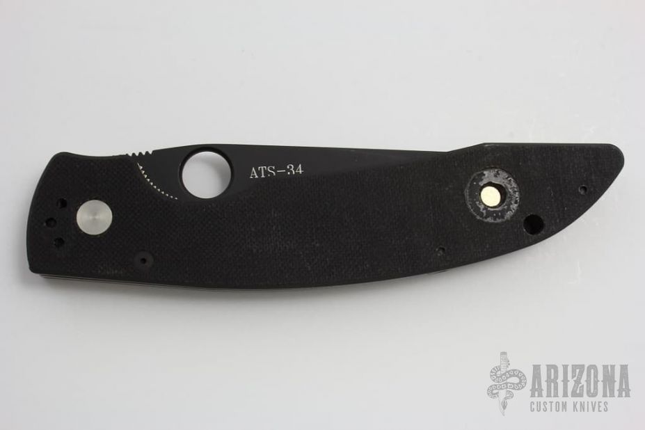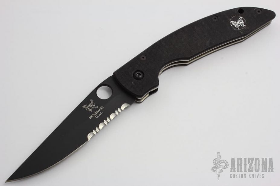 This AFCK Linerlock folder has a spear point blade with partial serrations, thumb hole, and notched thumb rest. Handle is black G10 over titanium liners, black fiber back spacer, lanyard hole. Has scuffs on the blade and handle. The clip is missing, and one of the Benchmade logo's on the handle is missing. Blade Steel: ATS-34