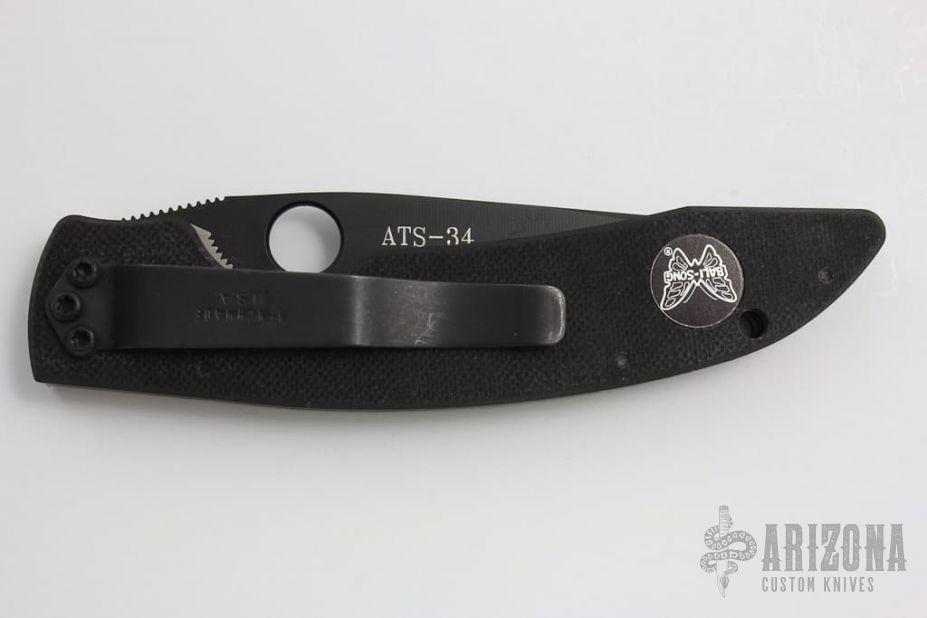 This Mini AFCK Linerlock folder has a spear point blade with partial serrations, thumb hole, and notched thumb rest. Handle is black G10 over titanium liners, black fiber back spacer, lanyard hole. Has a few light scuffs, excellent condition. Blade Steel: ATS-34