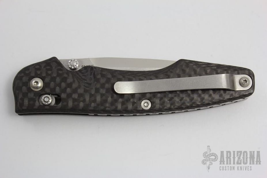 This axis locking folder features a stonewash finished blade with dual thumb-studs. The handle has black carbon fiber scales, stainless steel backspacer, and stainless steel clip, tip up carry. This knife is an Osborne Design. Comes with original box and papers. Excellent condition. Blade Steel: CPM154