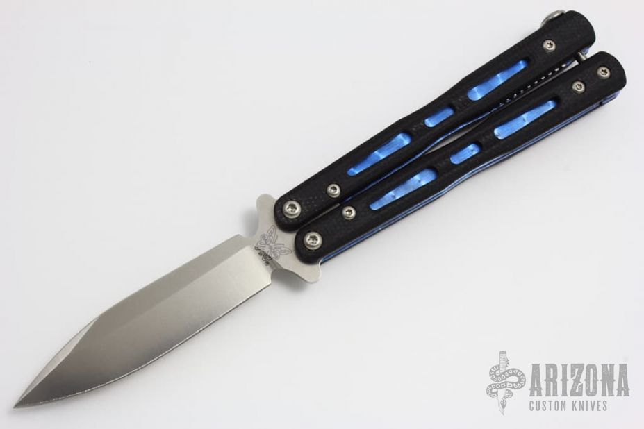 This Morpho 32 Balisong has a stone washed spear/ drop point D2 stainless steel blade. Handle is black G-10 with blue anodized titanium liners and milled stainless steel spacers. Blue anodized titanium tip up clip and next-gen kicker pin. Comes with original box and paperwork. Excellent condition. Blade Steel: D2