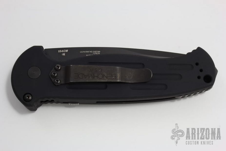 This 9051BK AFO II features a black spear-point blade. Black anodized aluminium handle. Integrated safety system. Has a black stainless steel clip, 4 way reversible. Some scuffing on the handle and clip. Comes with original sheath, box and papers. Excellent condition. Blade Steel: 154CM