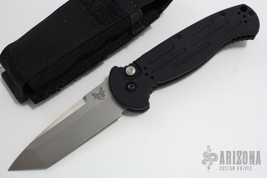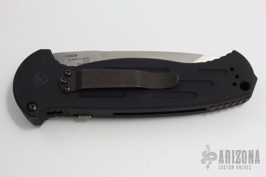 This 9052 AFO II auto has a tanto blade. Black anodized aluminium handle. Integrated safety system. Black stainless steel clip - 4 way reversible, and lanyard hole. Excellent condition. Comes with original nylon sheath, and original box and papers. Blade Steel: 154CM