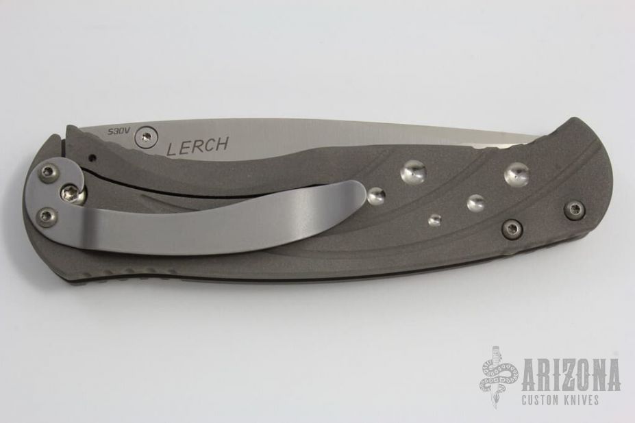 Satin finished S30V stainless steel drop point blade with single thumb stud. Bead blast and milled titanium frame with titanium barrel-type spacers, and satin finished stainless steel tip down clip. Very light scuff on clip, otherwise mint. Very responsive action. Comes with original box and drawstring pouch. Blade Steel: Satin Finished S30V
