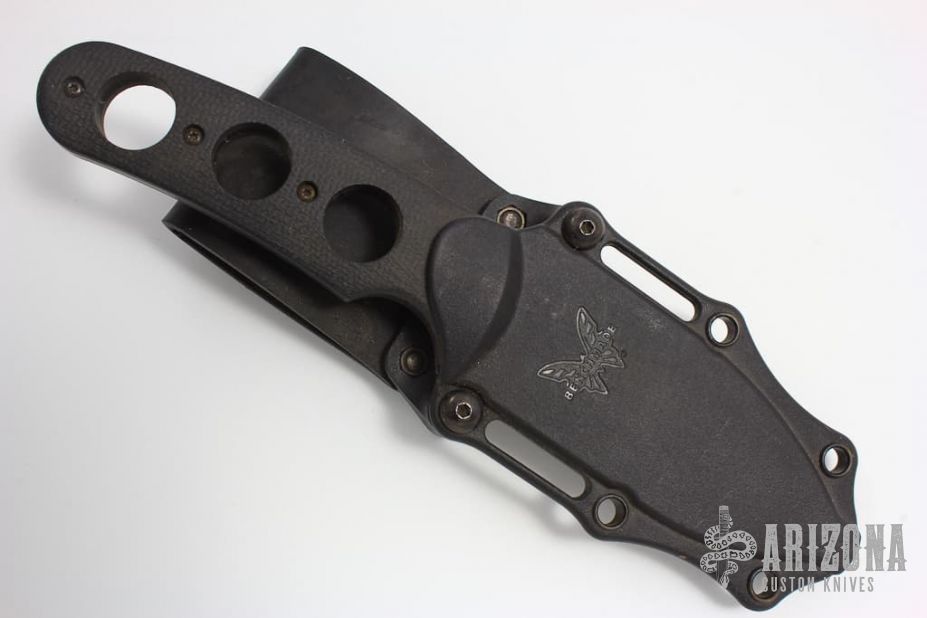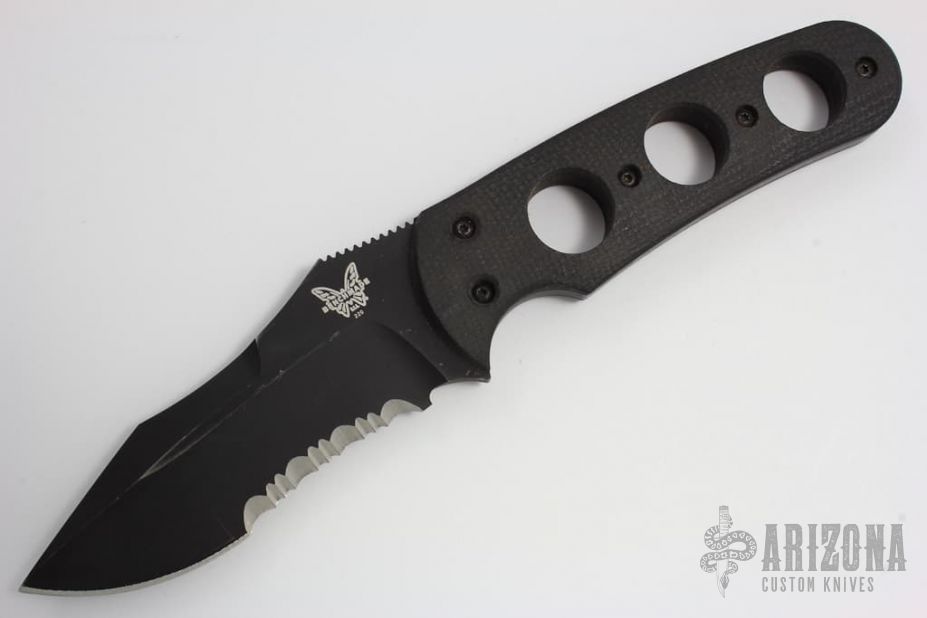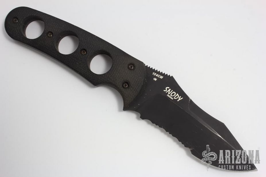 This fixed blade features a black partially serrated blade with a false top edge and notched thumb rest. Black G-10 scales with 3 holes. Black Kydex sheath with belt loop. Full tang construction with 1/8" blade stock and 1 1/4" blade depth. Has been used. Has scratches and scuffs on the blade. DISCONTINUED MODEL. Blade Steel: 154CM
