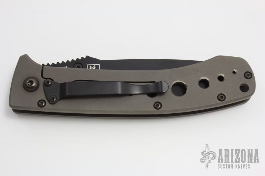 This 760SBK LFTI framelock folder is a classic Lum design and features a black coated CPM-M4 stainless steel tanto partially serrated blade with single thumb stud. Handle is bead blasted titanium with milled holes, black stainless steel tip down clip, and lanyard hole. Comes with original box and papers, Excellent condition.