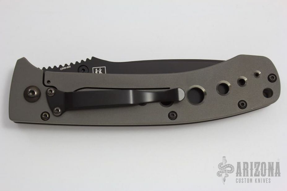 This 760BK LFTI framelock folder is a classic Lum design and features a black coated CPM-M4 stainless steel tanto blade with single thumb stud. Handle is bead blasted titanium with milled holes, black stainless steel tip down clip, and lanyard hole. Comes with original box and papers, excellent+ condition. Blade Steel: CPM-M4