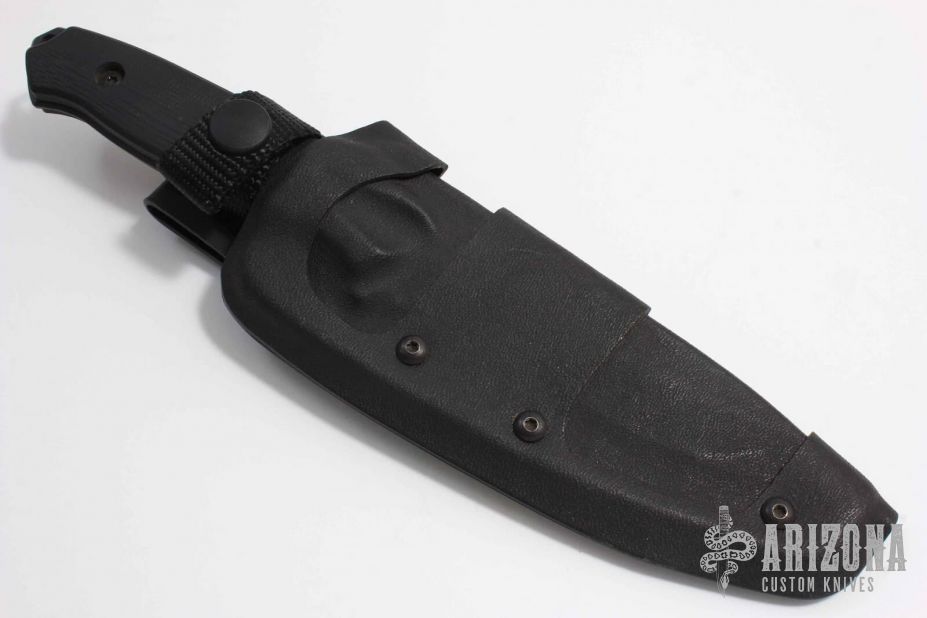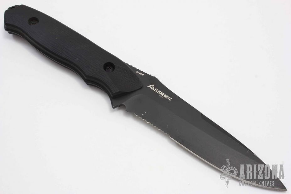 This Nimravus has a black blade with partially serrated edge, 1/8" blade stock and 1 1/8" blade depth, full tang construction with black G10 scales and lanyard hole. Kydex belt sheath. Allen Elishewitz design. Has scuffs and scratches, has been used and carried.