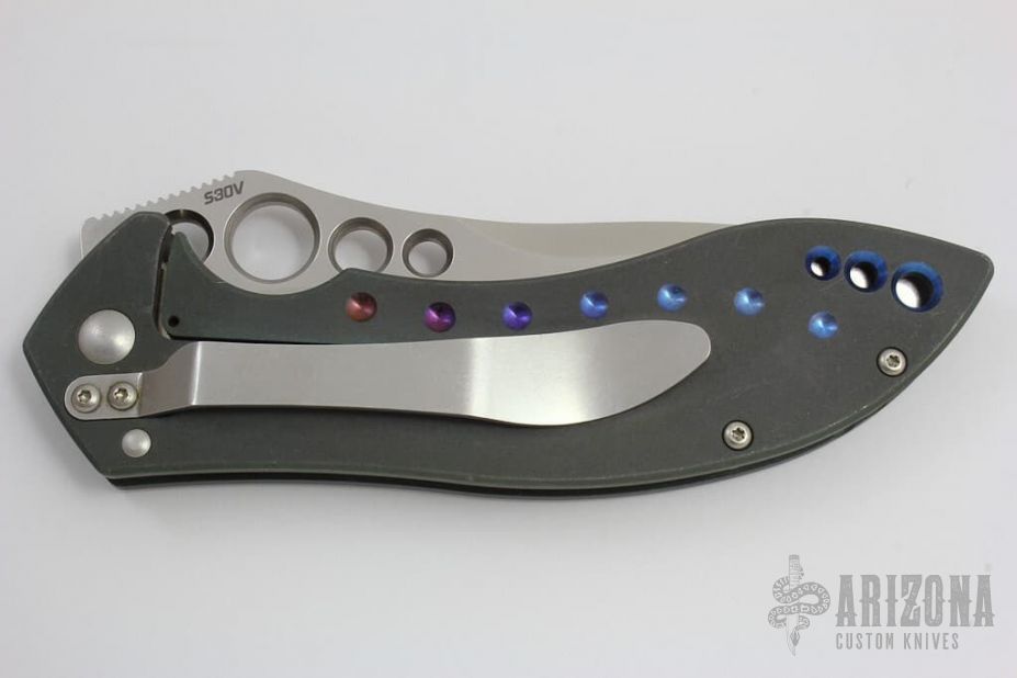This knife features a tumble finished recurve blade with thumbhole and notched thumbrest. The handle is anodized and bead blasted titanium with a tip down stainless steel clip. Comes with Benchmade box and papers (not original). Has been used and carried, has scuffs on frame. Nice detent, lockup and blade seating. "Prototype Feb. 2004" on blade.