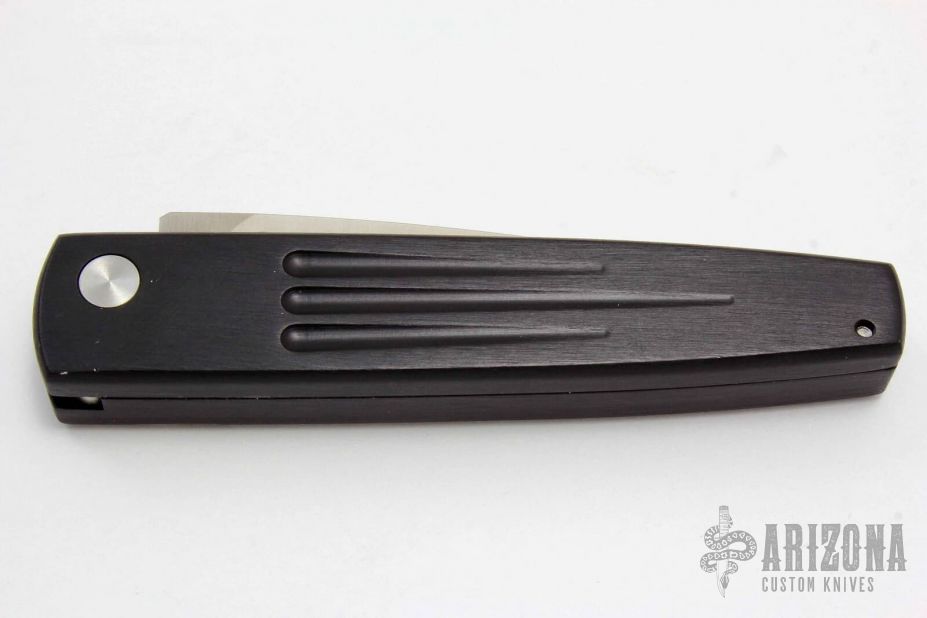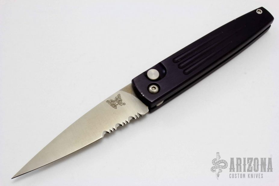 Side opening automatic with a satin finish partially serrated blade and anodized aluminum frame. Includes original box and paperwork. Mint condition.