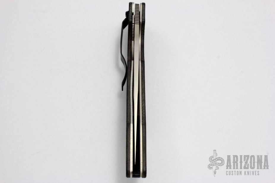 This AFCK Linerlock folder has a spear point blade, thumb hole, and notched thumb rest. Handle is black G10 over titanium liners, black fiber back spacer, lanyard hole. Excellent condition.