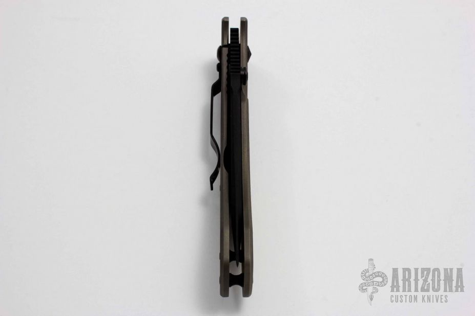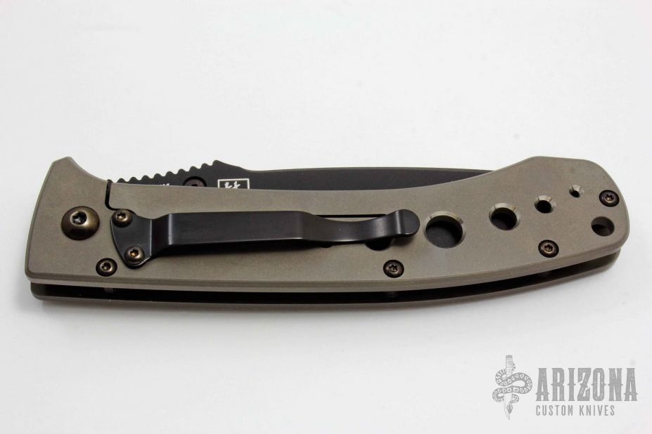 This 760SBK LFTI framelock folder is a classic Lum design and features a black coated CPM-M4 stainless steel tanto partially serrated blade with single thumb stud. Handle is bead blasted titanium with milled holes, black stainless steel tip down clip, and lanyard hole. Has a few light scuffs, otherwise Excellent condition.