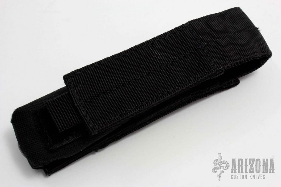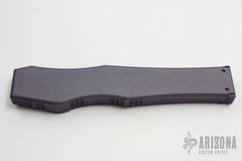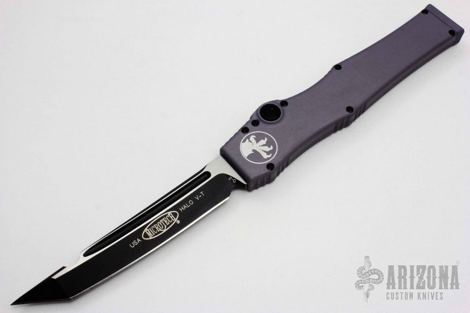 Automatic Out-The-Front Knife. tanto blade with a two-tone black finish and a plain edge. Grey anodized aluminum handle and black finished hardware. Comes with nylon velcro case. Has some light scuffs on the frame, good condition.