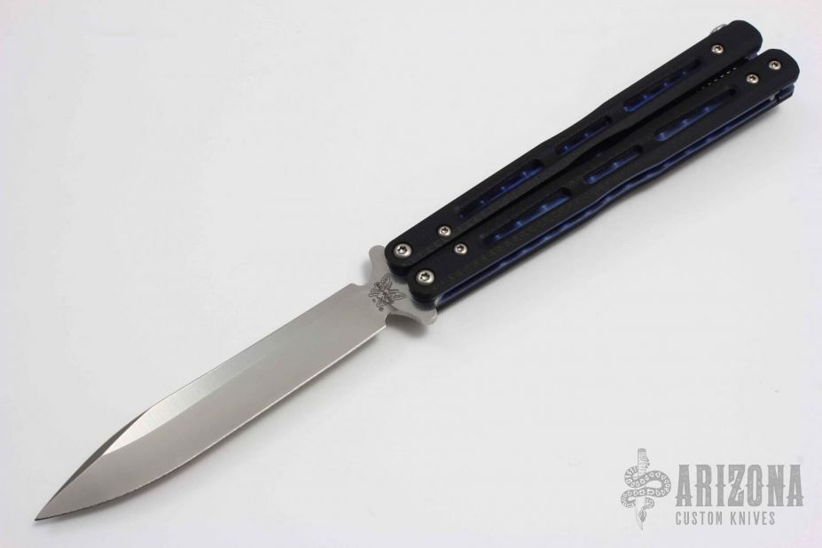 This Model 51 Morpho Balisong has a satin finished D2 stainless steel spear point blade. Handle is black G10 with blue jeweled/ anodized titanium liners and blue anodized titanium tip up clip. Other than a couple of extremely small chips to the blade edge (close to blade tip), knife is in excellent condition. Comes with drawstring pouch and original box and papers.