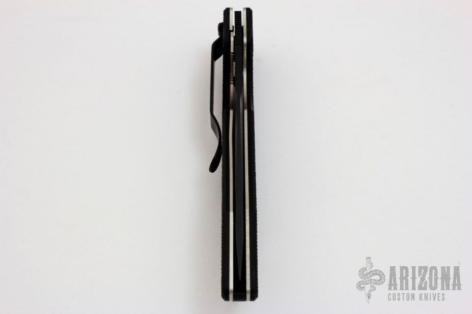 This Mini AFCK tanto linerlock folder has a BT2 coated tanto blade with partial serrations, thumb hole, and notched thumb rest. Handle is black G10 over stainless liners, black fiber back spacer, lanyard hole. Comes with original box and papers. "Jun. 2000" on back of blade. Excellent condition.