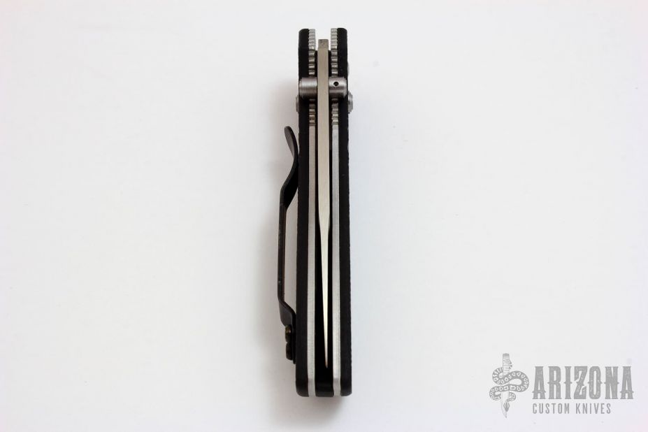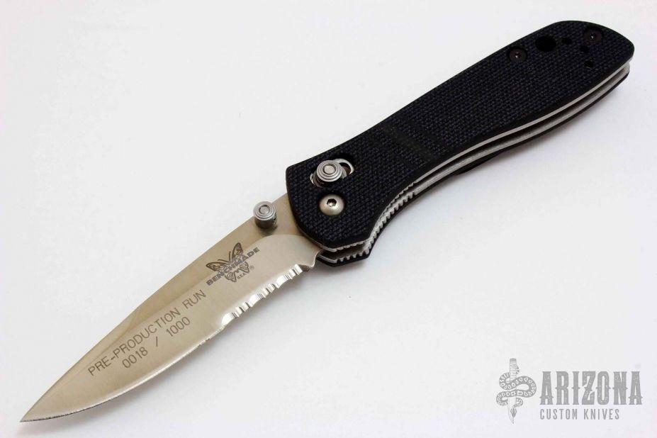 McHenry & Williams design. Axis lock. Satin partially serrated blade with dual thumbstuds. The handle has black G-10 scales, stainless steel liners, black G-10 backspacer and a tip up stainless clip, left or right reversible. Discontinued model. Pre-Production 0018/1000. Includes original box and papers. Excellent condition. Blade is hand signed "W McHenry & Williams"