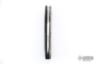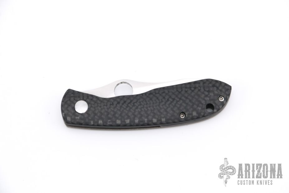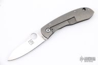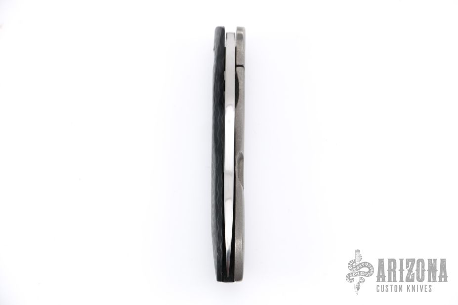 This Mini Daws framelock folder features a hand-rubbed satin finish blade with textured thumbhole. The handle has a tumbled titanium frame with carbon fiber front scale. Amazing attention to detail. Smooth action. Nice blade seating, detent, and lockup. Excellent work. Excellent condition. Comes with leather zippered case.