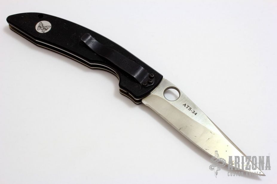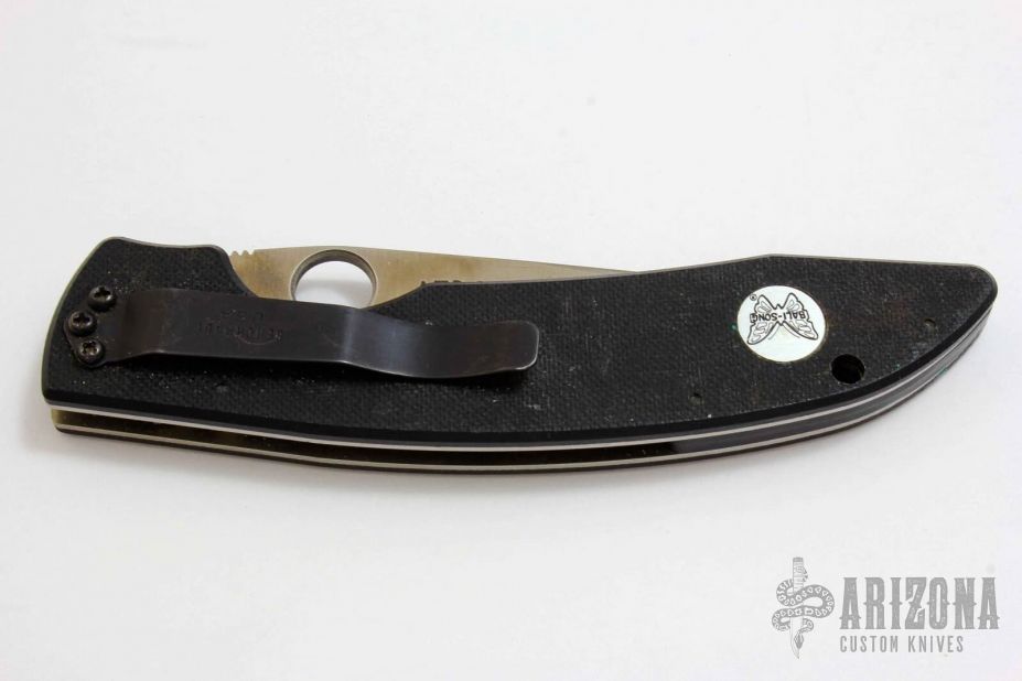 This AFCK Linerlock folder has a satin finished spear point blade, thumb hole, and notched thumb rest. Handle is black G10 over titanium liners, black fiber back spacer, lanyard hole. Has been used and carried, scuffs, scratches resharpened.